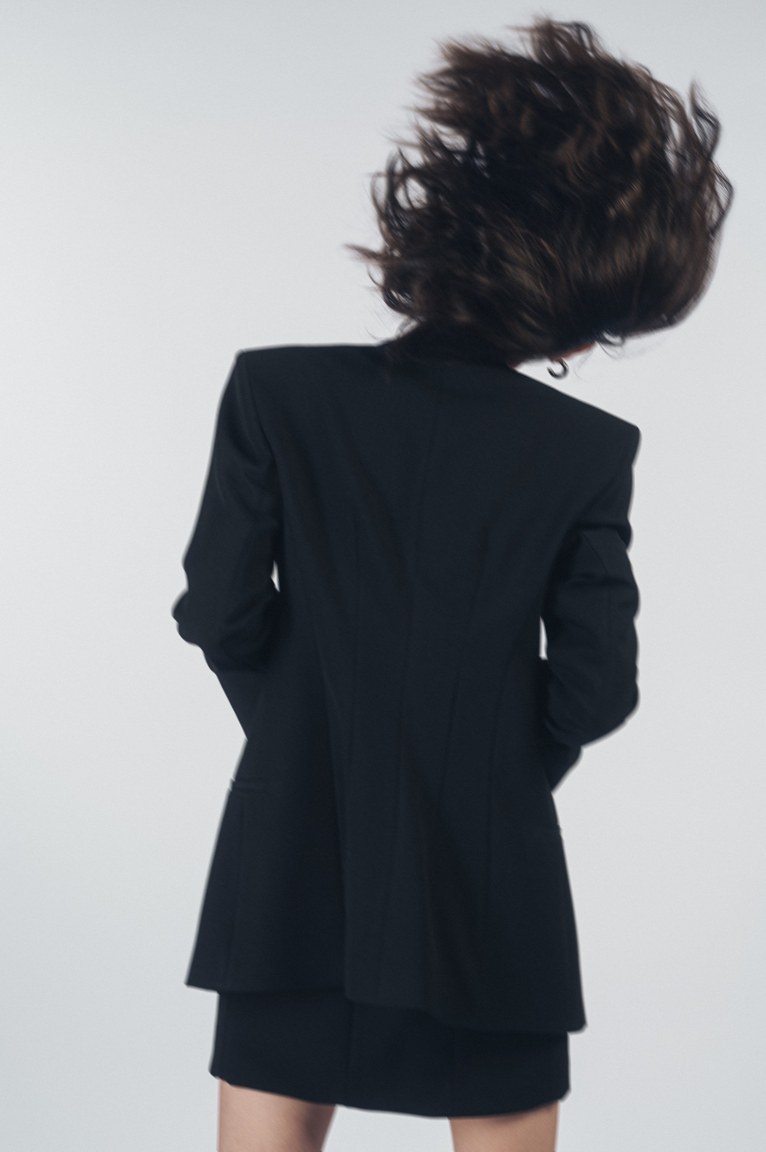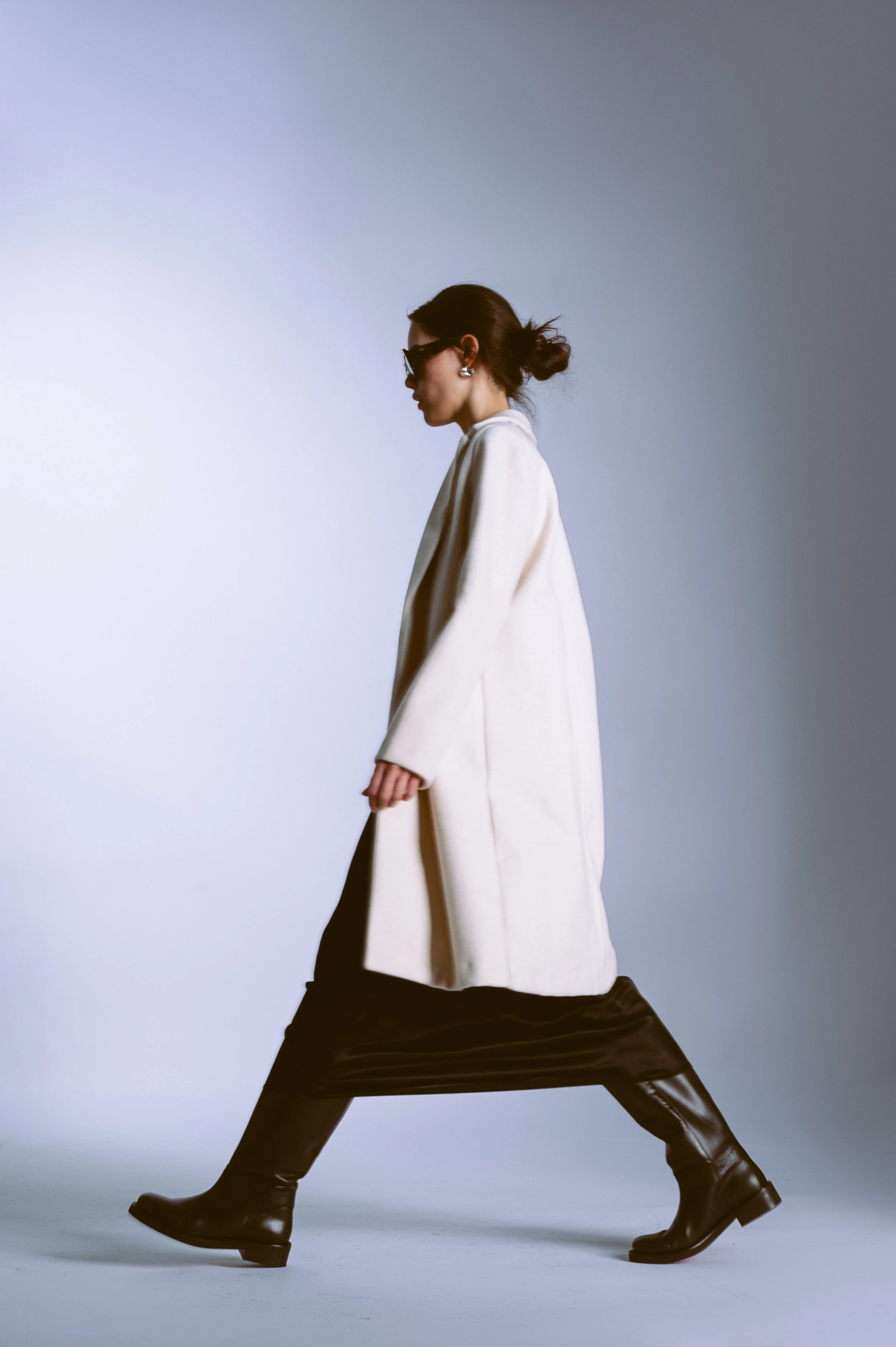 Woman with dark hair and sunglasses wearing a white coat and black dress