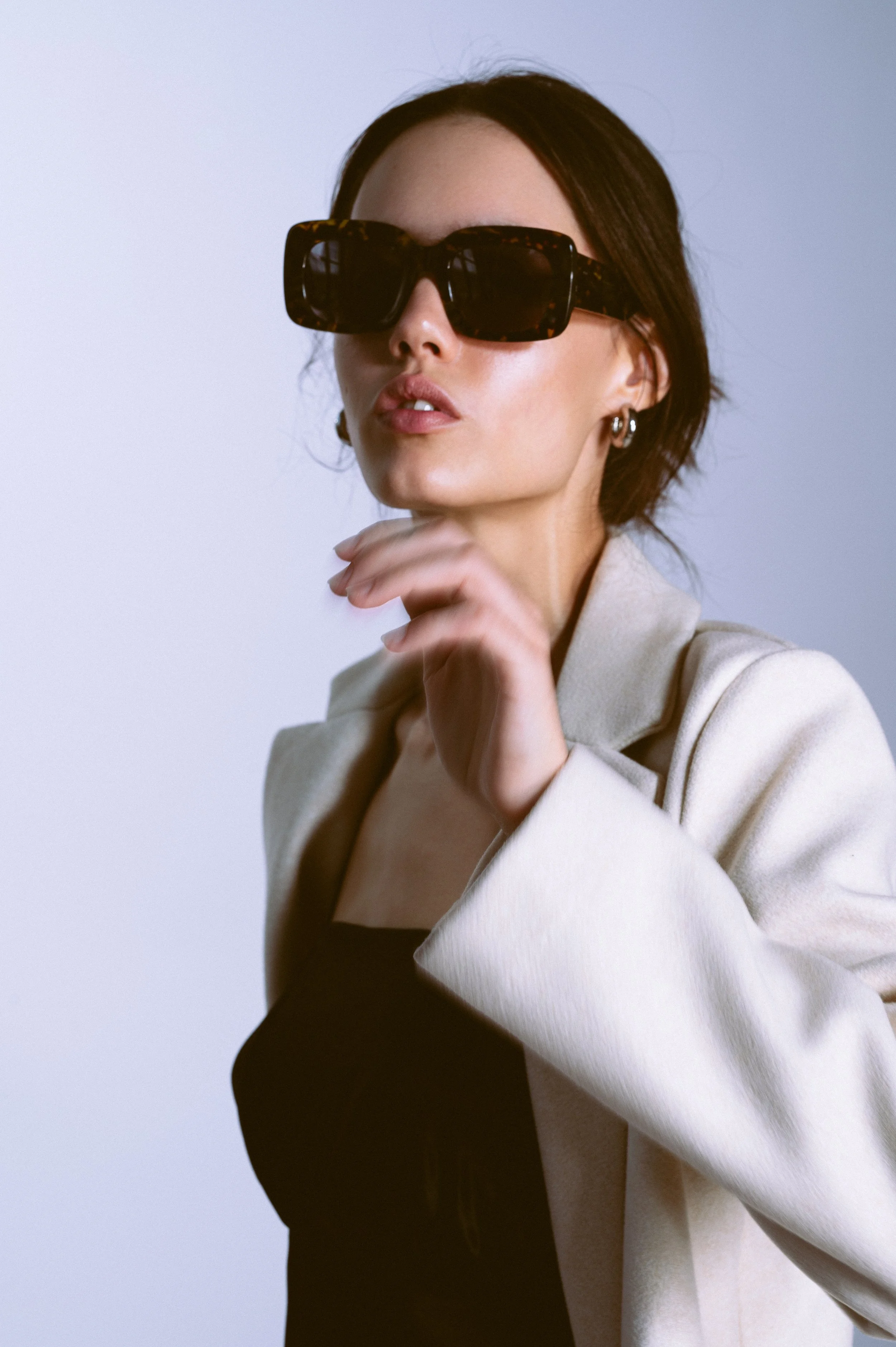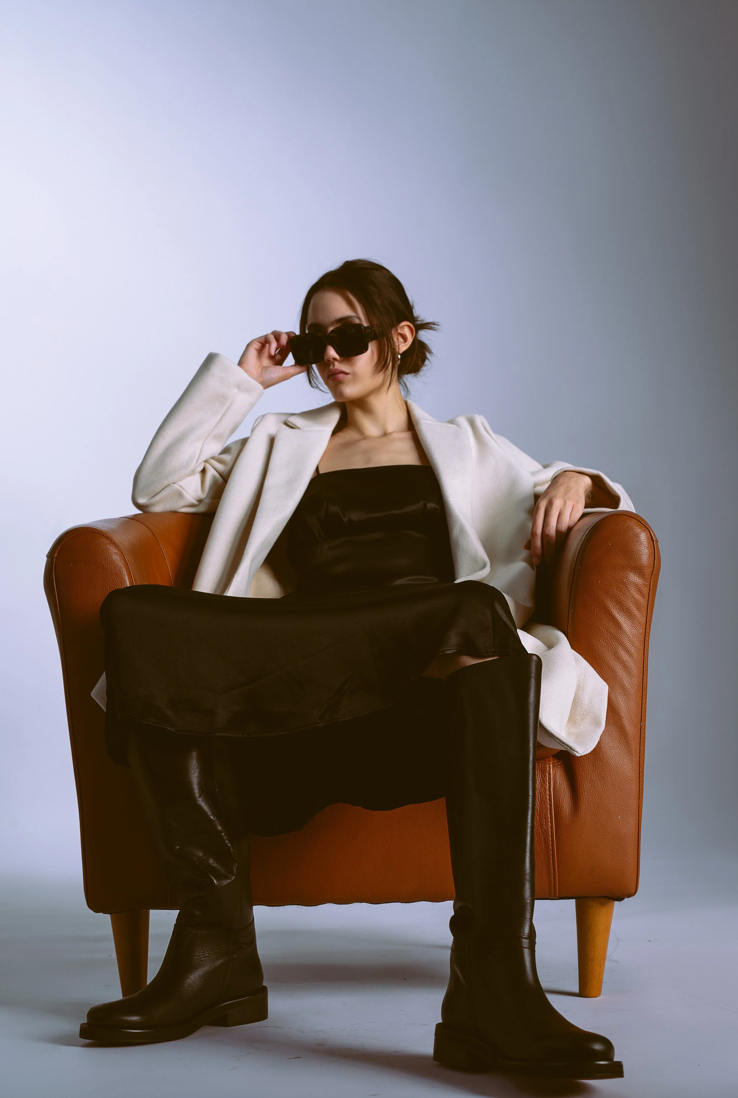 Stylish woman in sunglasses seated in a brown leather chair wearing white coat and black outfit