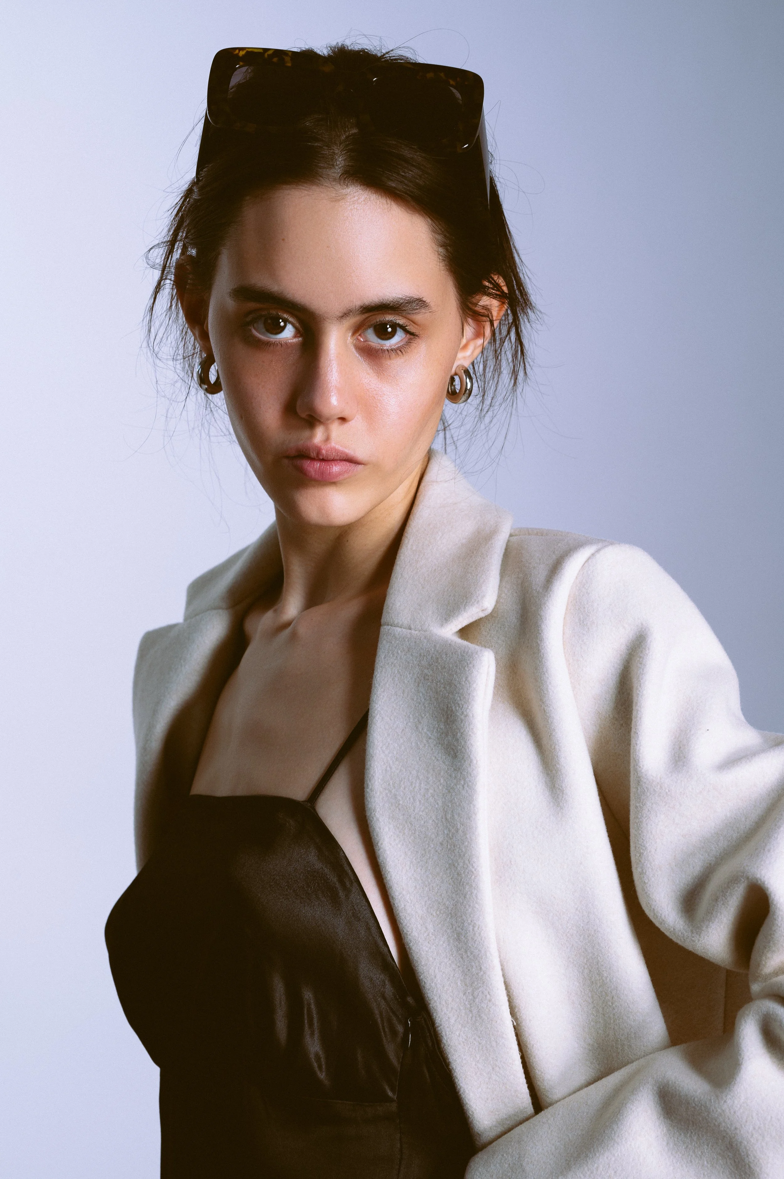Woman with dark hair and sunglasses wearing a white coat and black dress View fullsize